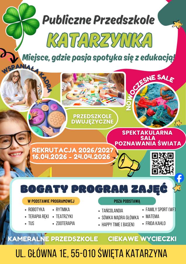 Do końca roku szkolnego 2025/2026 realizujemy również projekt unijny "Katarzynka przyjazna wszystkim dzieciom" (szczegóły w zakładce Aktualności).