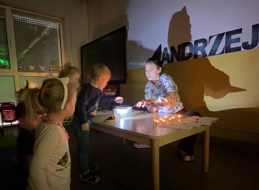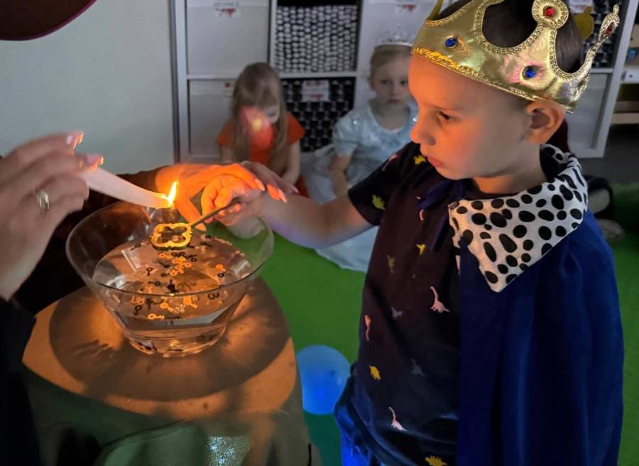 Dzieci z ogromnym zaangażowaniem uczestniczyły w tradycyjnych wróżbach – laliśmy wosk przez zaczarowany klucz, losowaliśmy symboliczne karteczki i odkrywaliśmy przyszłe przygody. Każda wróżba wywoływała mnóstwo emocji, śmiechu i ciekawości.