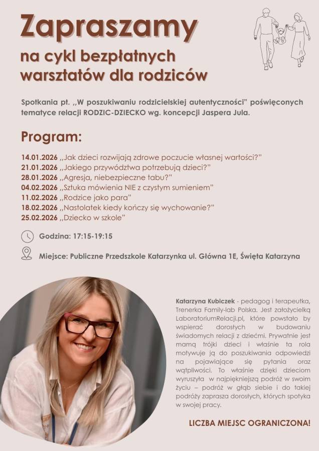 Prowadzący: Katarzyna Kubiczek - pedagog i socjoterapeutka, Trenerka Family-lab Polska. Jest założycielką LaboratoriumRelacji.pl, które powstało by wspierać dorosłych w budowaniu świadomych relacji z dziećmi. Prywatnie jest mamą trójki dzieci i właśnie ta rola motywuje ją do poszukiwania odpowiedzi na pojawiające się pytania oraz wątpliwości. Dzięki dzieciom wyruszyła w najpiękniejszą podróż w swoim życiu – podróż w głąb siebie i do takiej podróży zaprasza dorosłych, których spotyka w swojej pracy. Więcej informacji na www.katarzynakubiczek.pl lub www.family-lab.pl